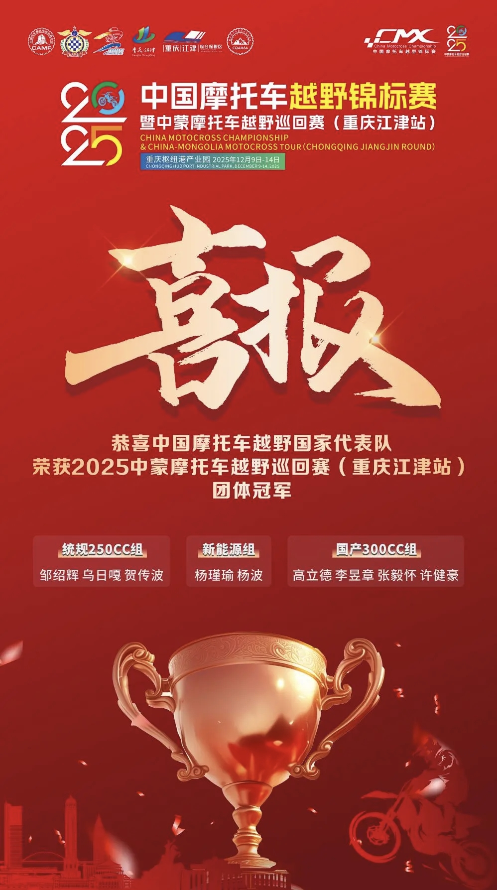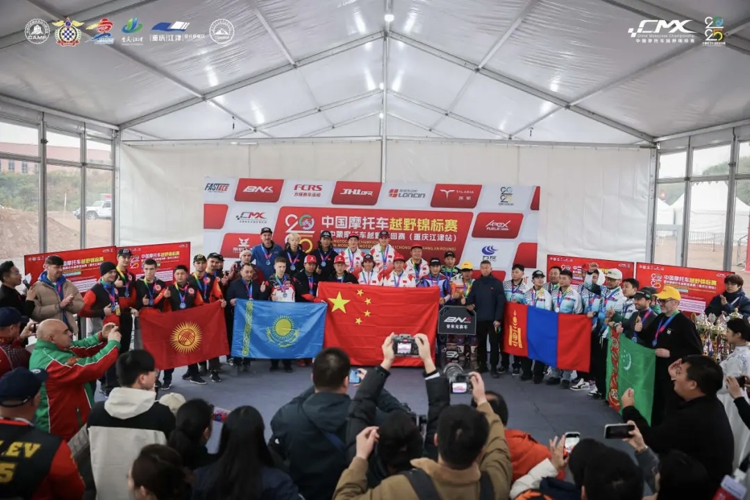 近日,2025年中蒙摩托车越野巡回赛(重庆江津站)在重庆市枢纽港产业园(江津区峻驰赛车运动基地)开幕,来自中蒙及多国的近50名顶尖车手齐聚江津同场竞技,最终中国国家代表队荣获本站赛事团体冠军。